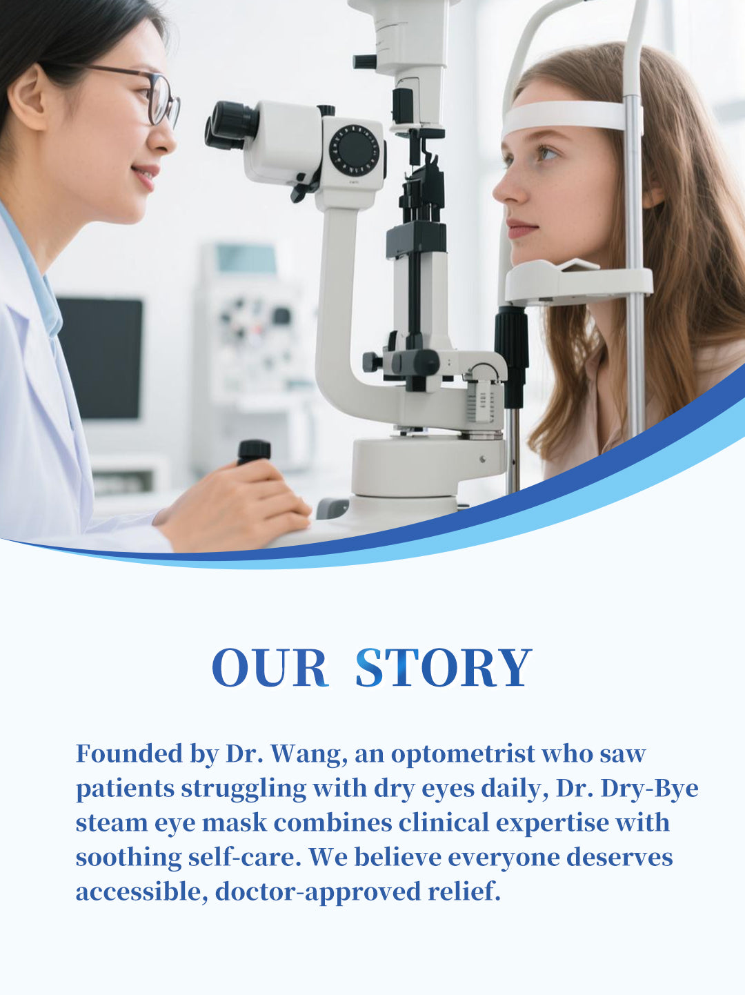 Determined to help both her patients and herself, Dr. Wang set out to create something different: a solution that was effective, comforting, and easy to use every day. That vision became the Dr. Dry-Bye Steam Eye Mask—a product born from both professional expertise and personal experience.
